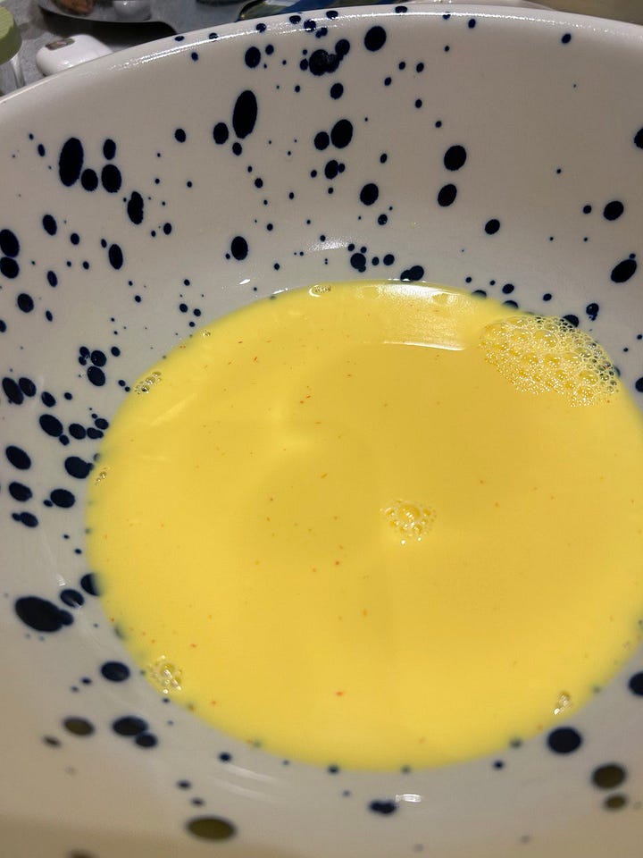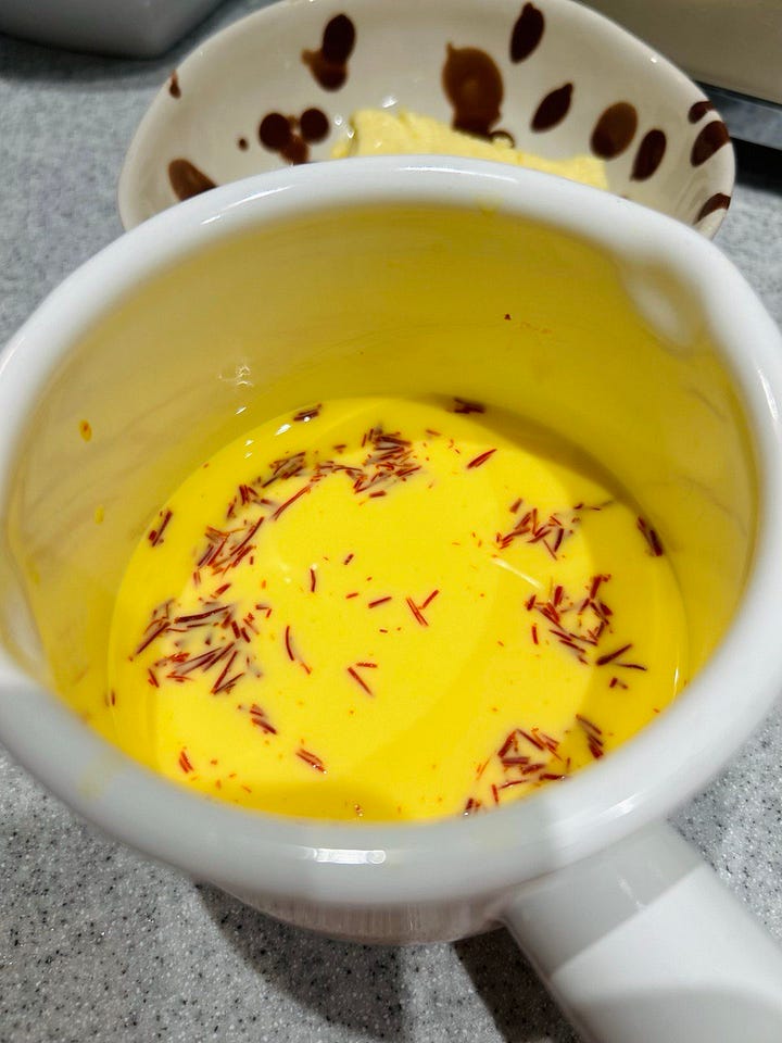 1. Если вы используете нити шафрана, замочите их в молоке, чтобы оно приобрело насыщенный желтый цвет.